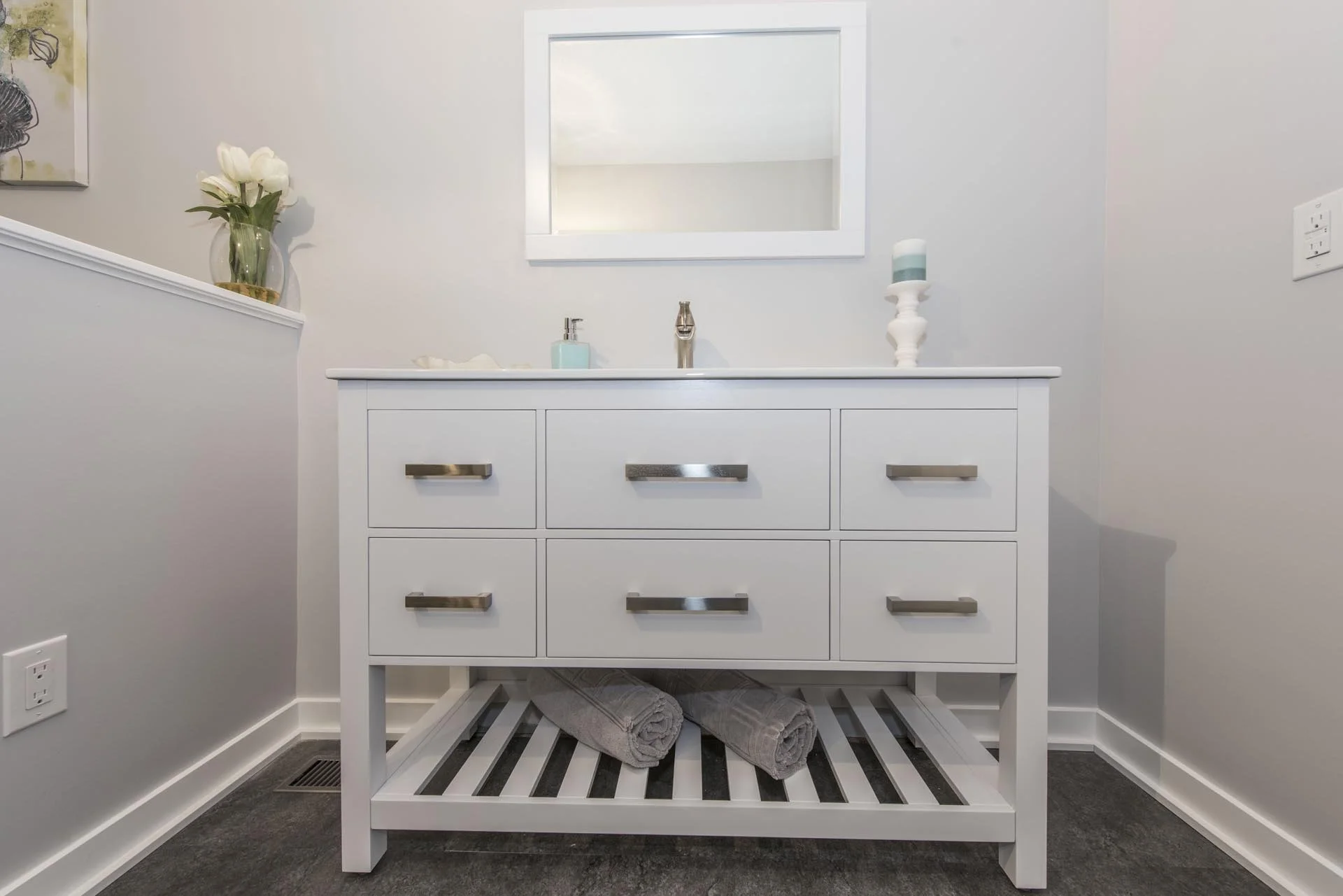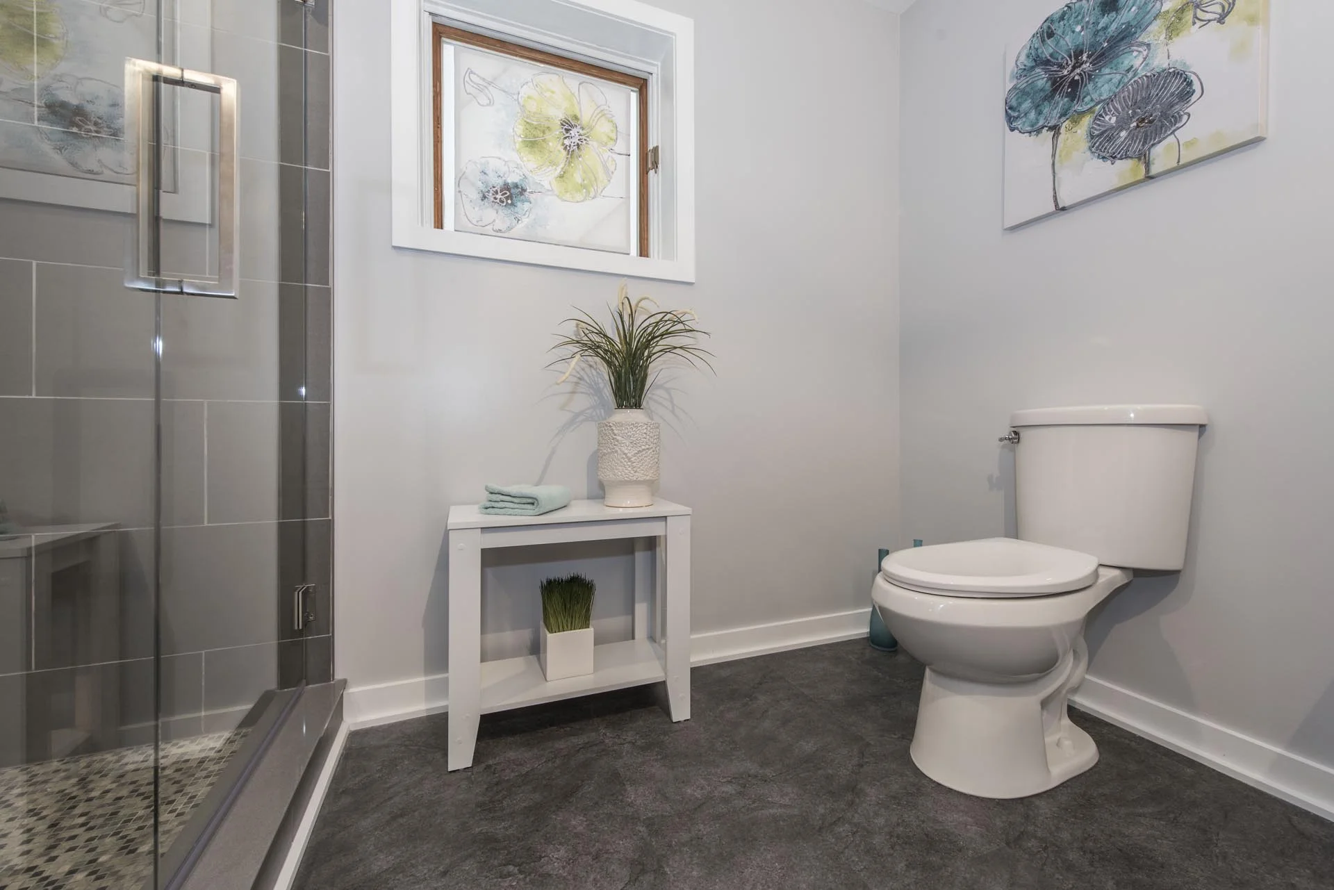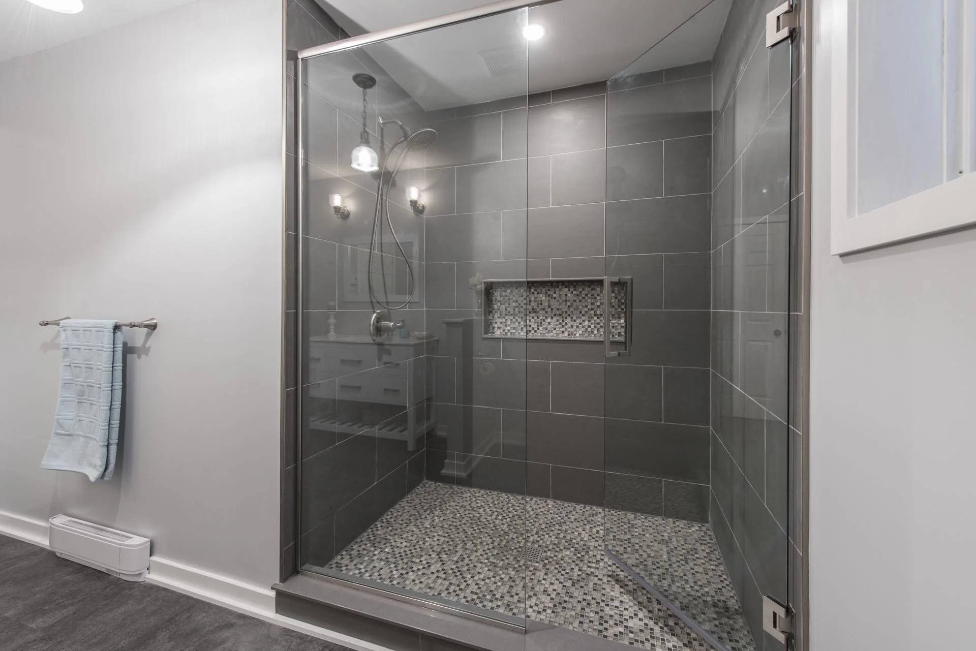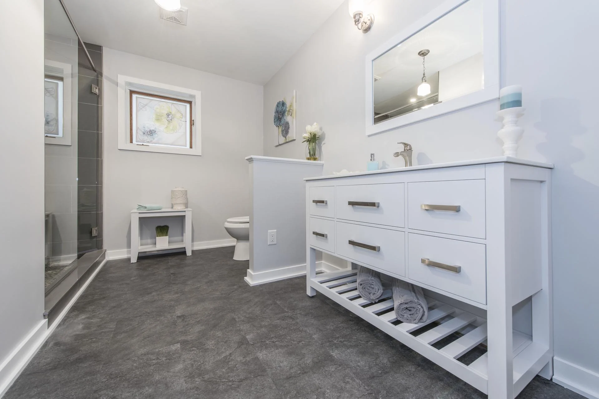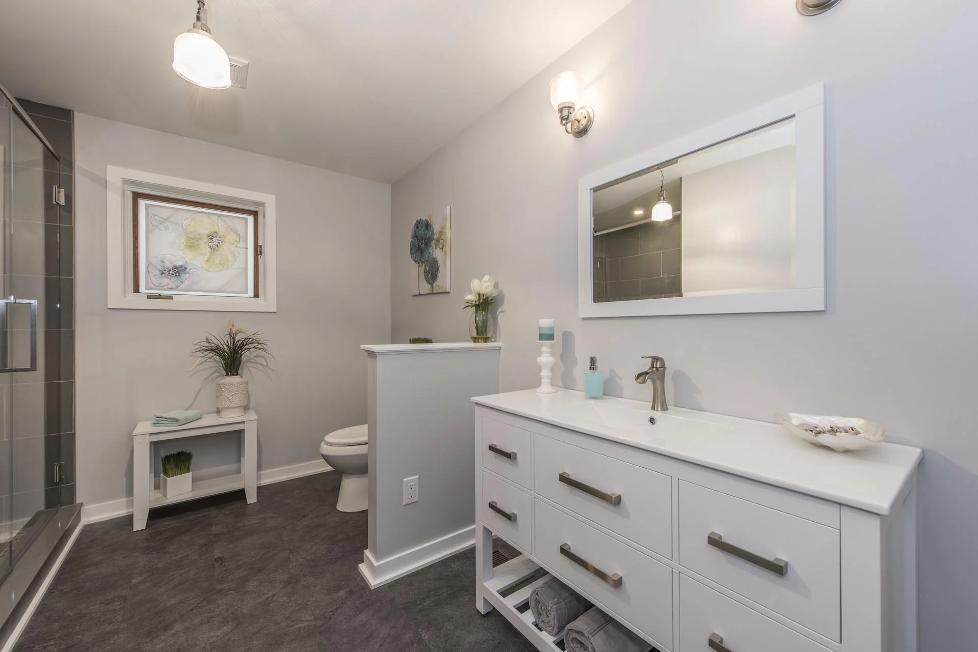 We completely gutted a dated, 4-piece bathroom and remodelled it into a relaxing retreat. This bathroom features a custom shower with floor-to-ceiling tile, mosaic tile wall niche, and a glass door. It also features vinyl flooring, a 4ft wide vanity, and a modern trim package.