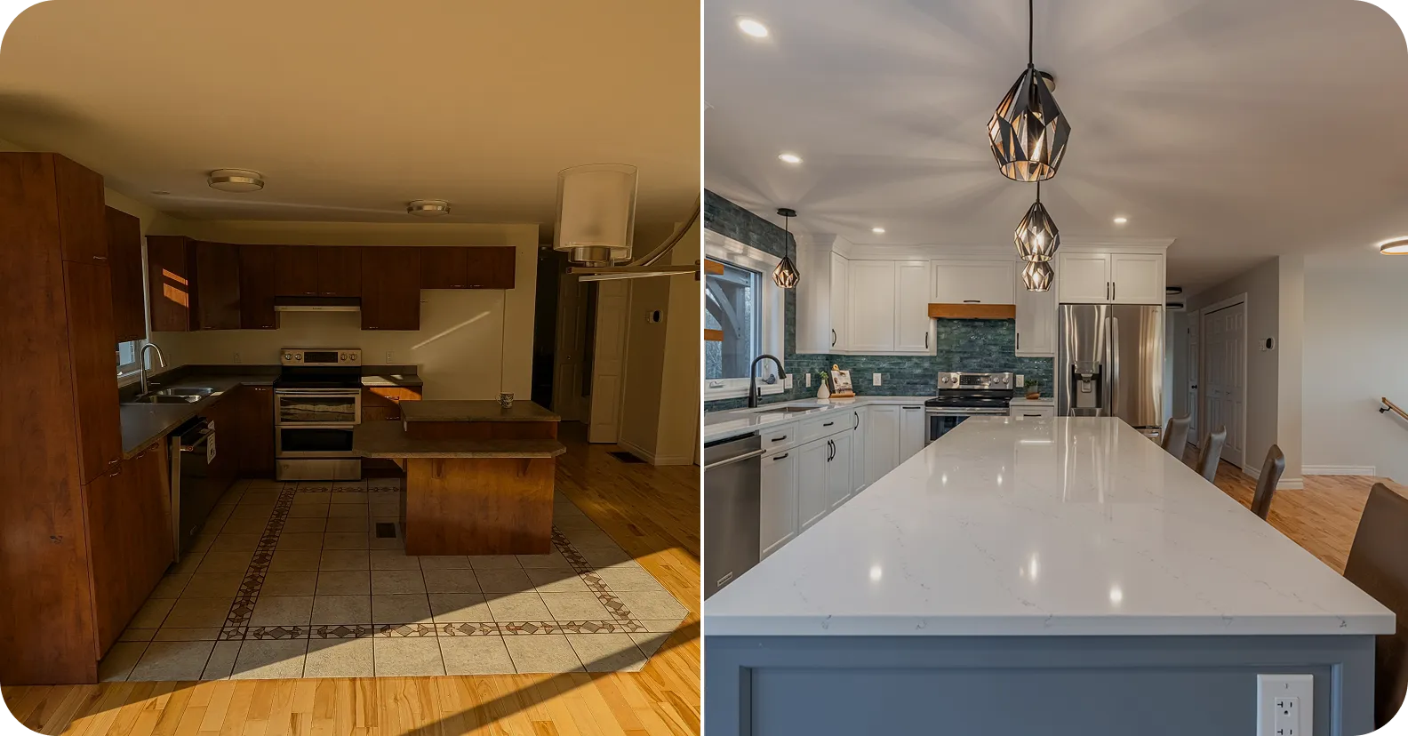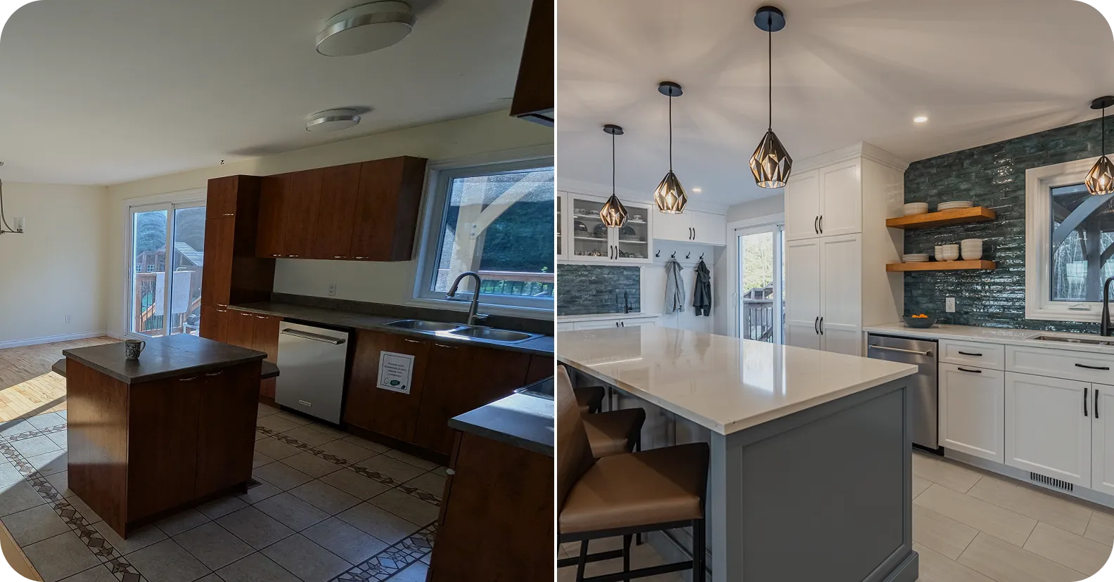 Dysfunctional and unsafe main staircase. Closed off and dark kitchen that did not utilize all the square footage to their advantage. Storage was lacking, so we added two new storage areas (back ‘mudroom’ cabinetry off the back deck/patio door, large walk-in coat closet in the basement underneath the new staircase)