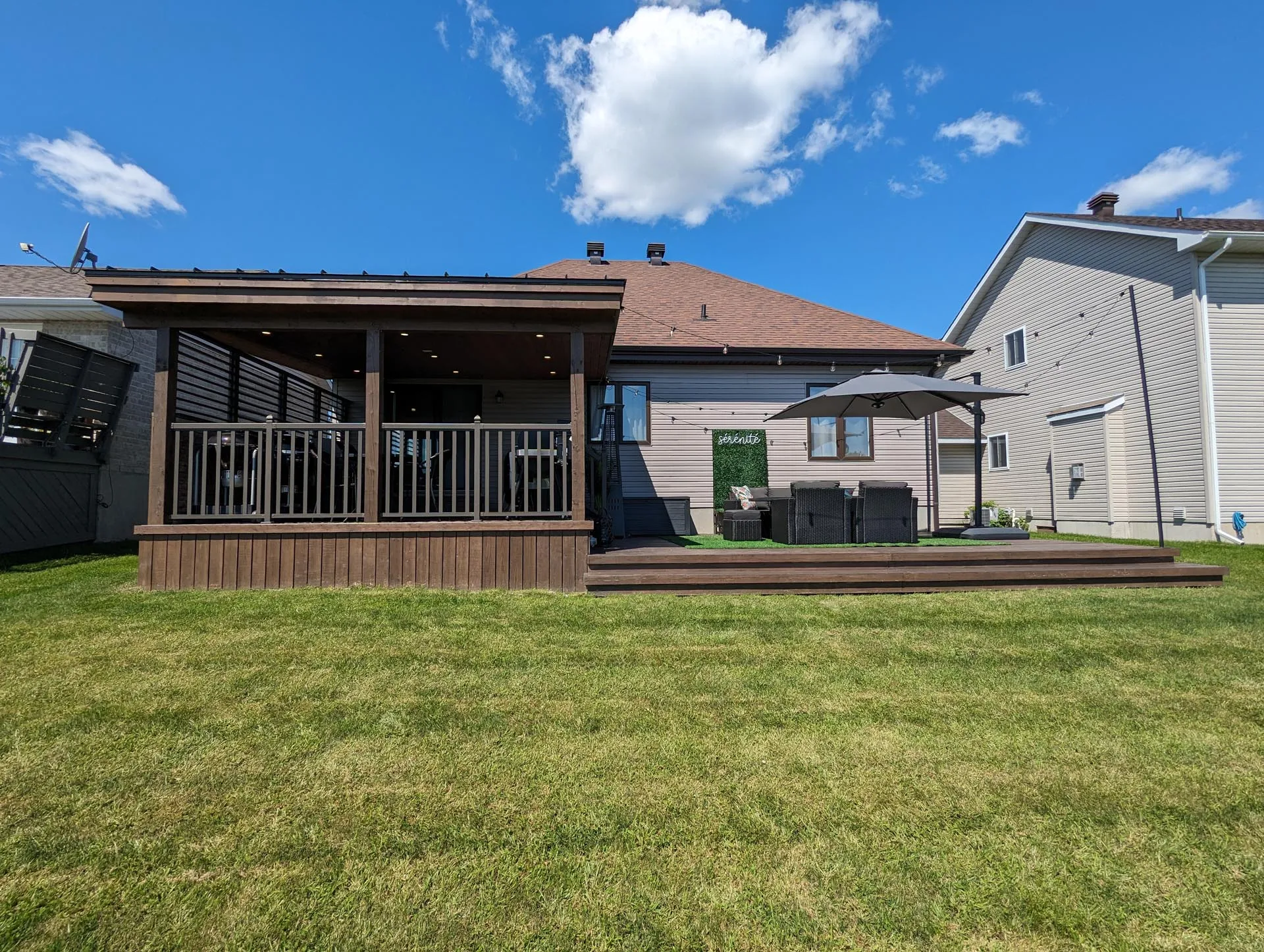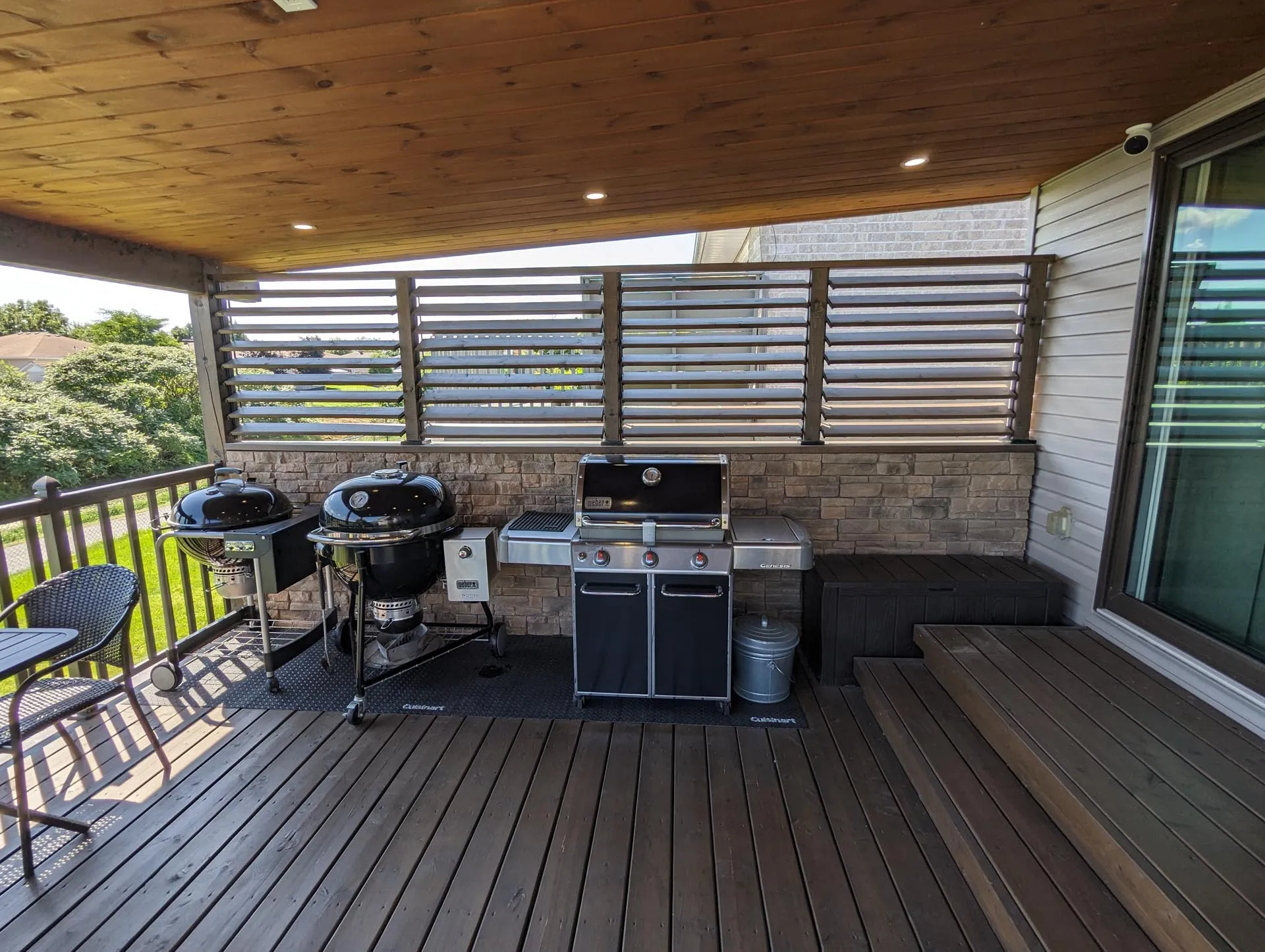 This deck features an upper-level covered deck area complete with a solid standing seam metal roof, tongue and groove pine ceiling with pot lights, a custom stone privacy wall with operable louvres, and beautiful aluminum railings. The lower level deck features a large surface area and wrap-around stairs.