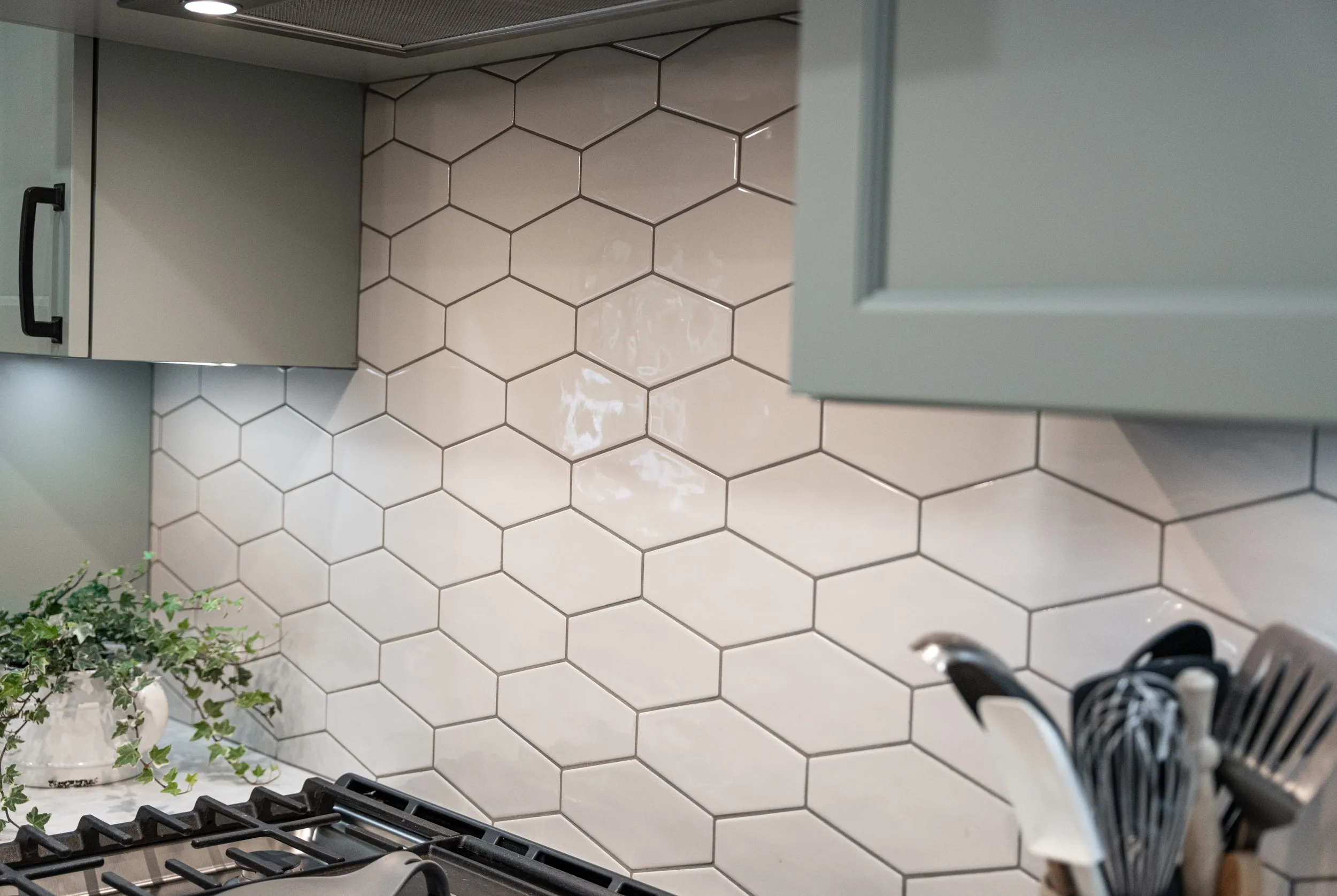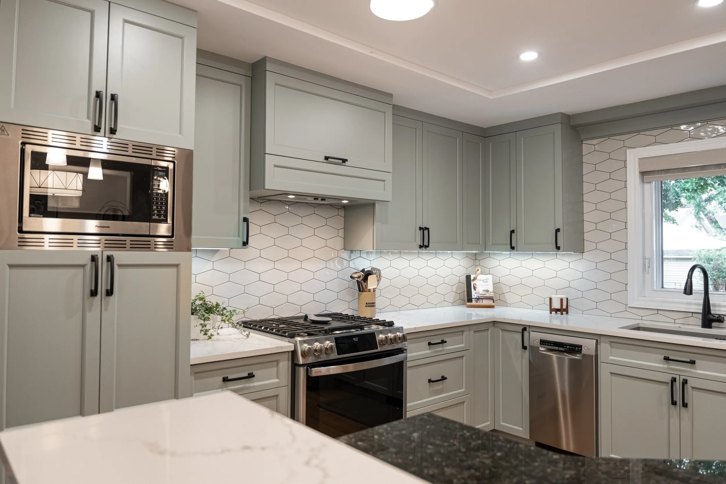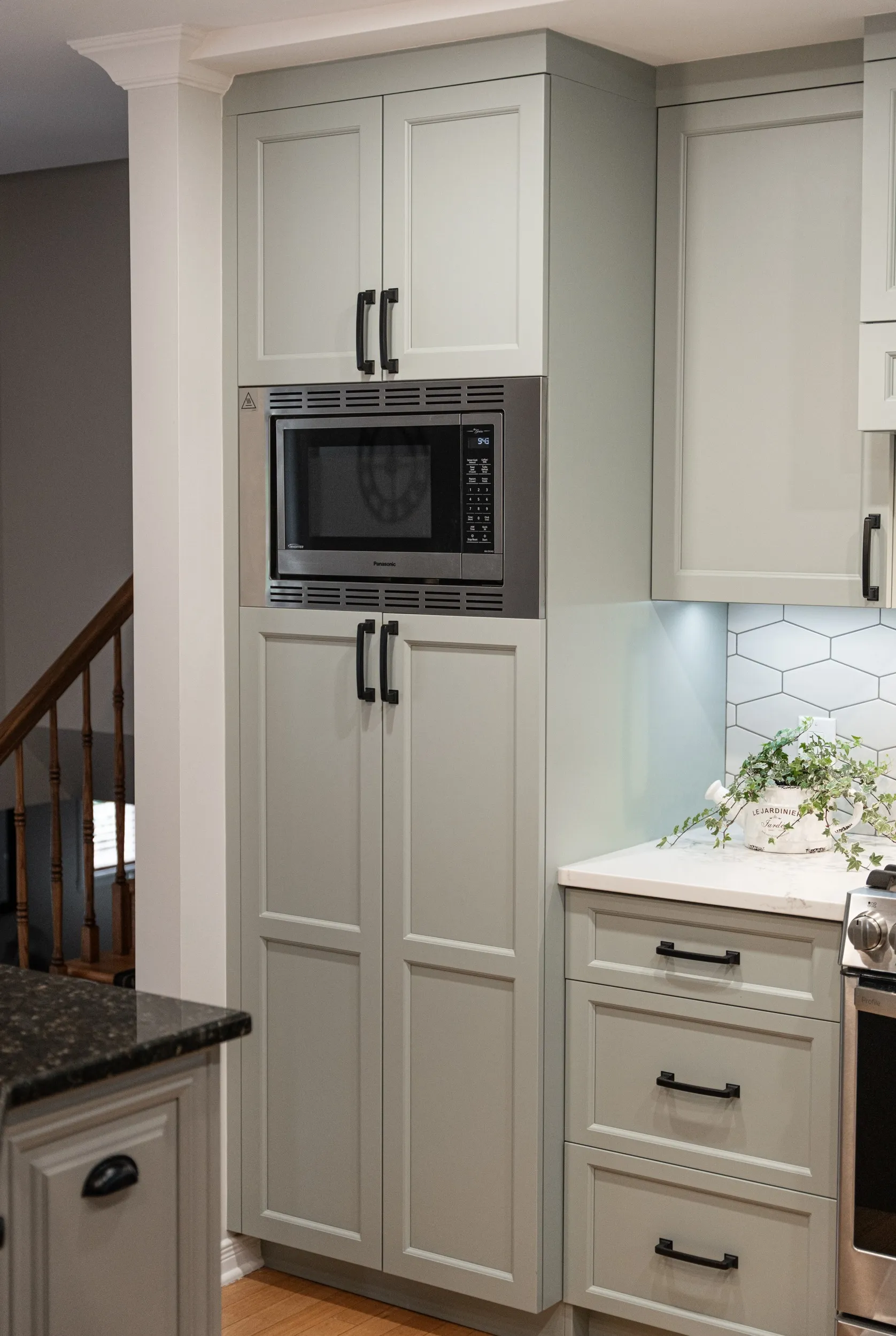 Custom cabinetry paired with quartz countertops, ceramic tile backsplash, and detailed custom trim and millwork, creating a functional and visually striking kitchen.