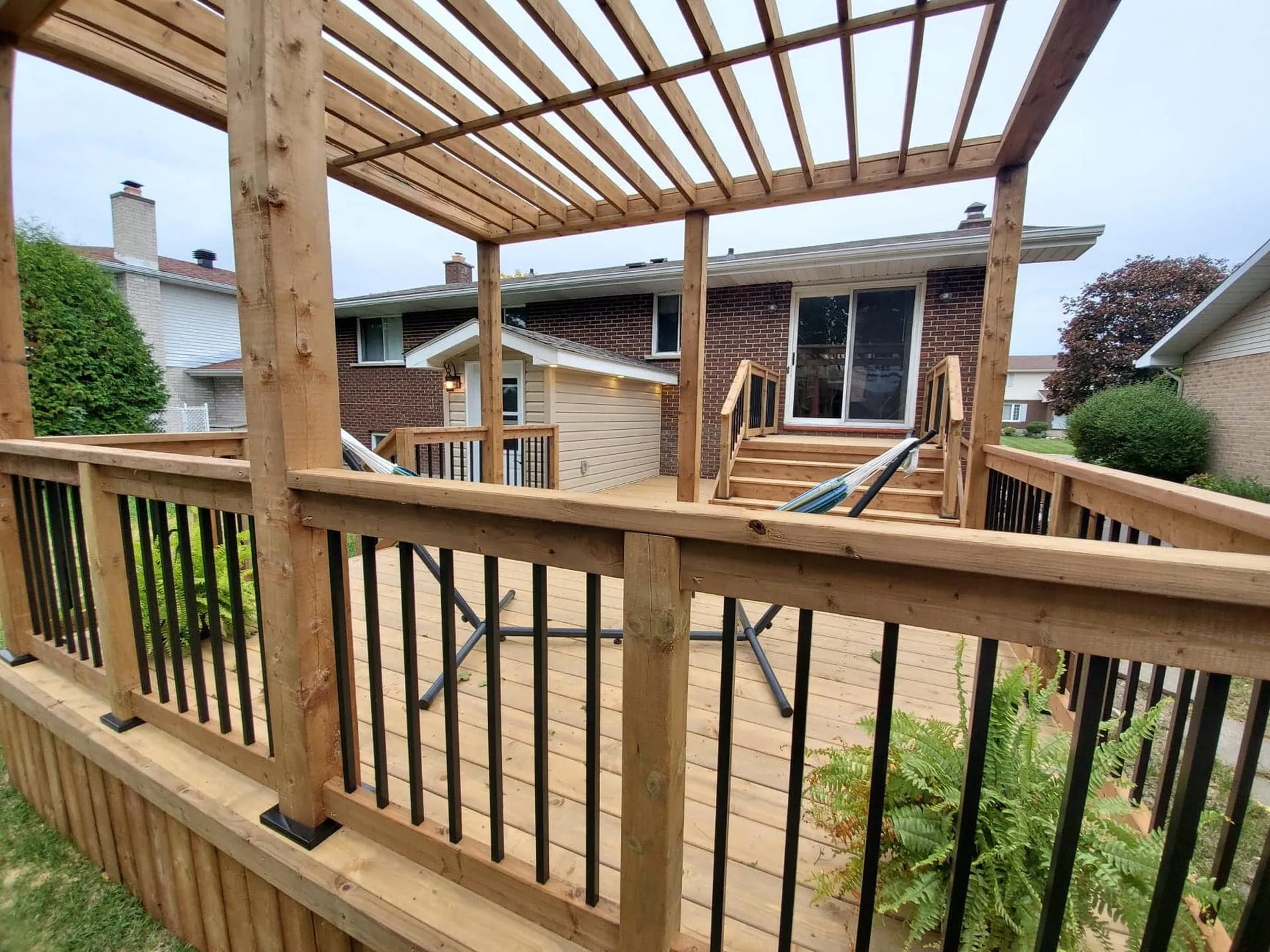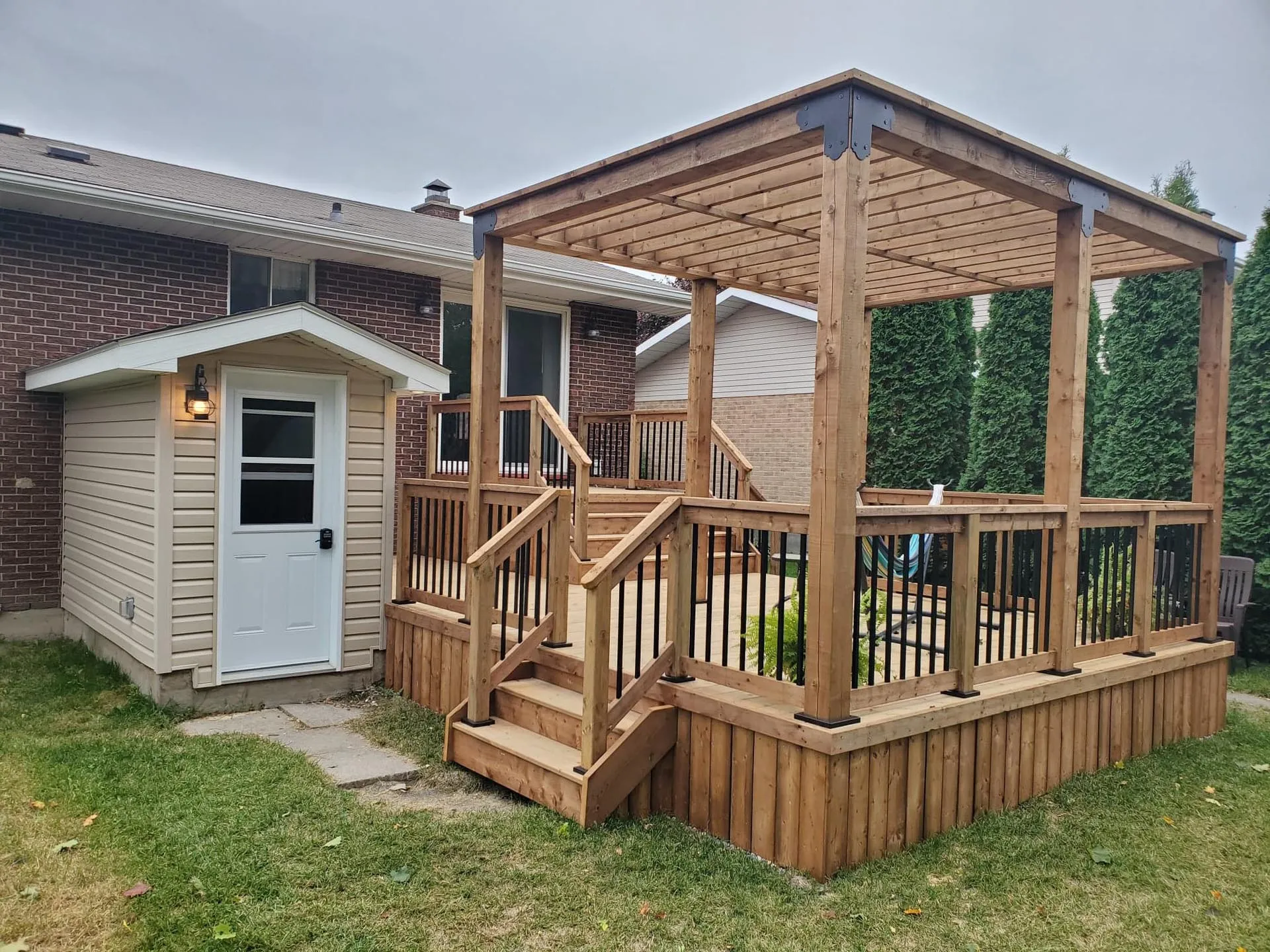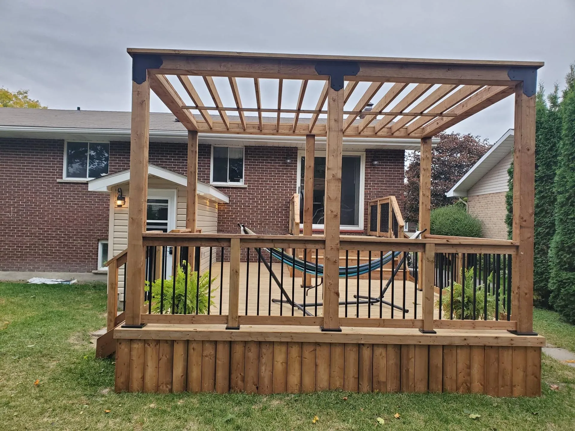 Custom two-level deck with a pergola and covered walkout, creating an inviting and versatile outdoor space for entertaining and year-round enjoyment.