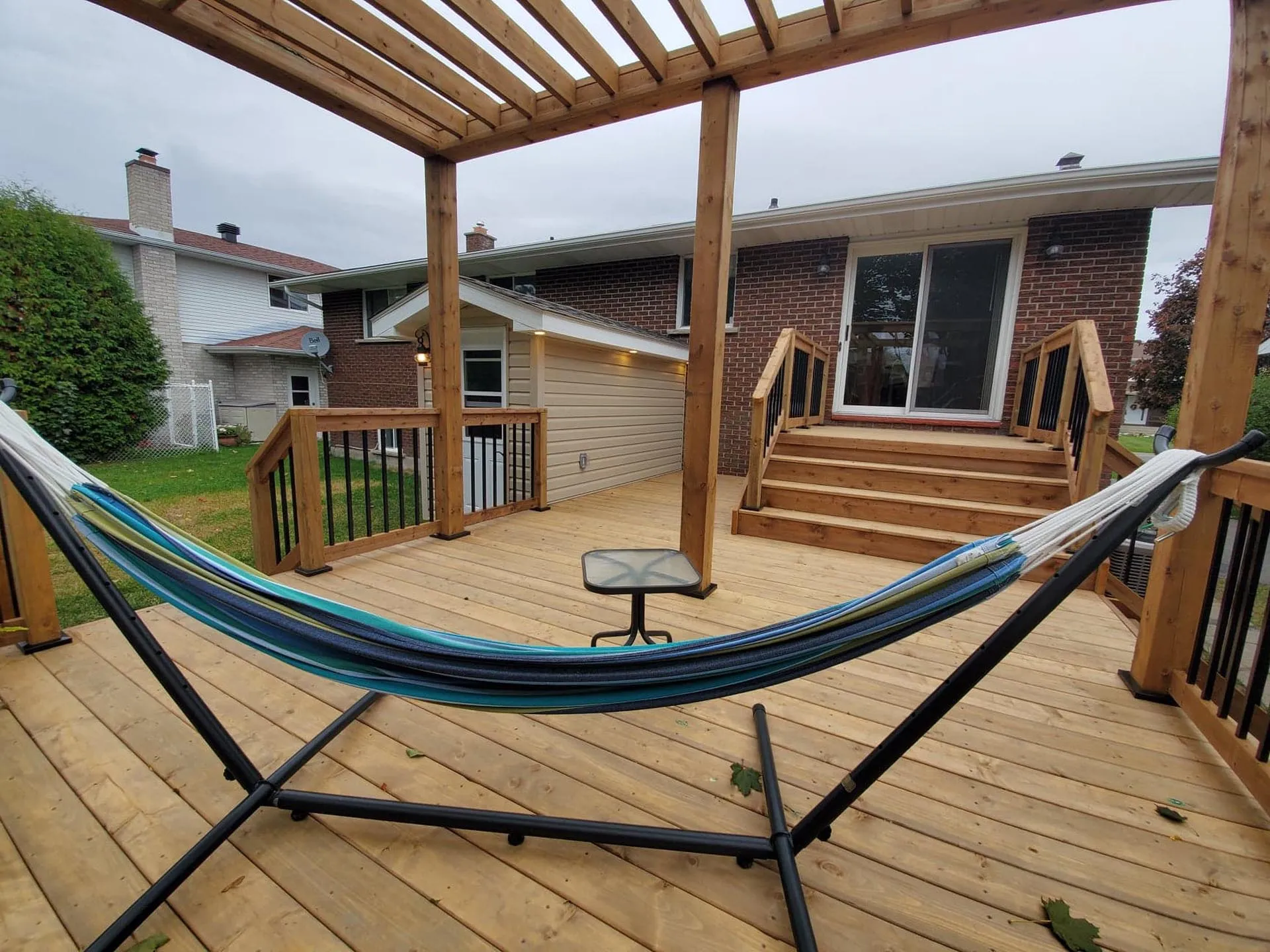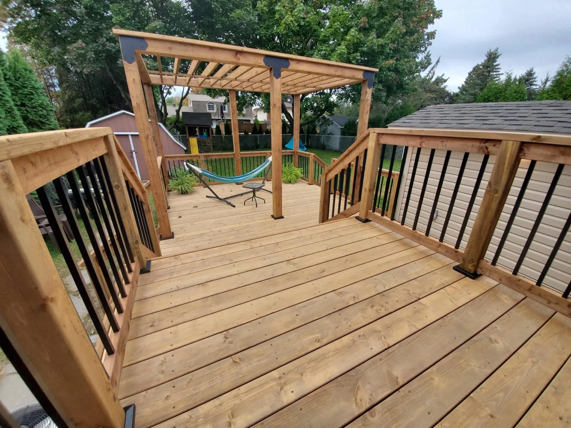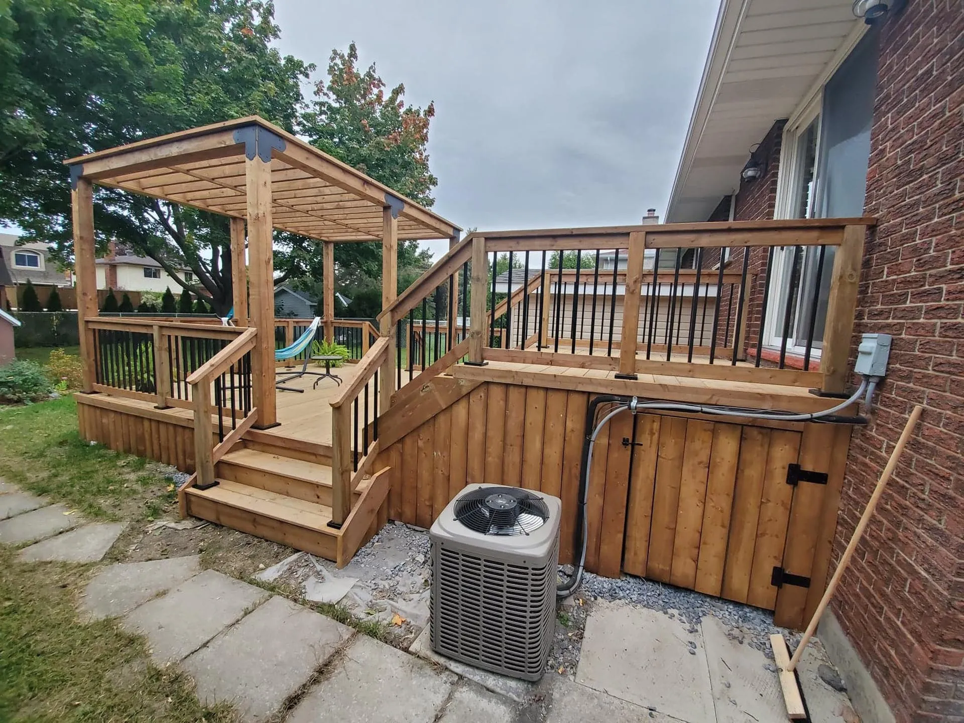 Custom two-level deck with a pergola and covered walkout, creating an inviting and versatile outdoor space for entertaining and year-round enjoyment.