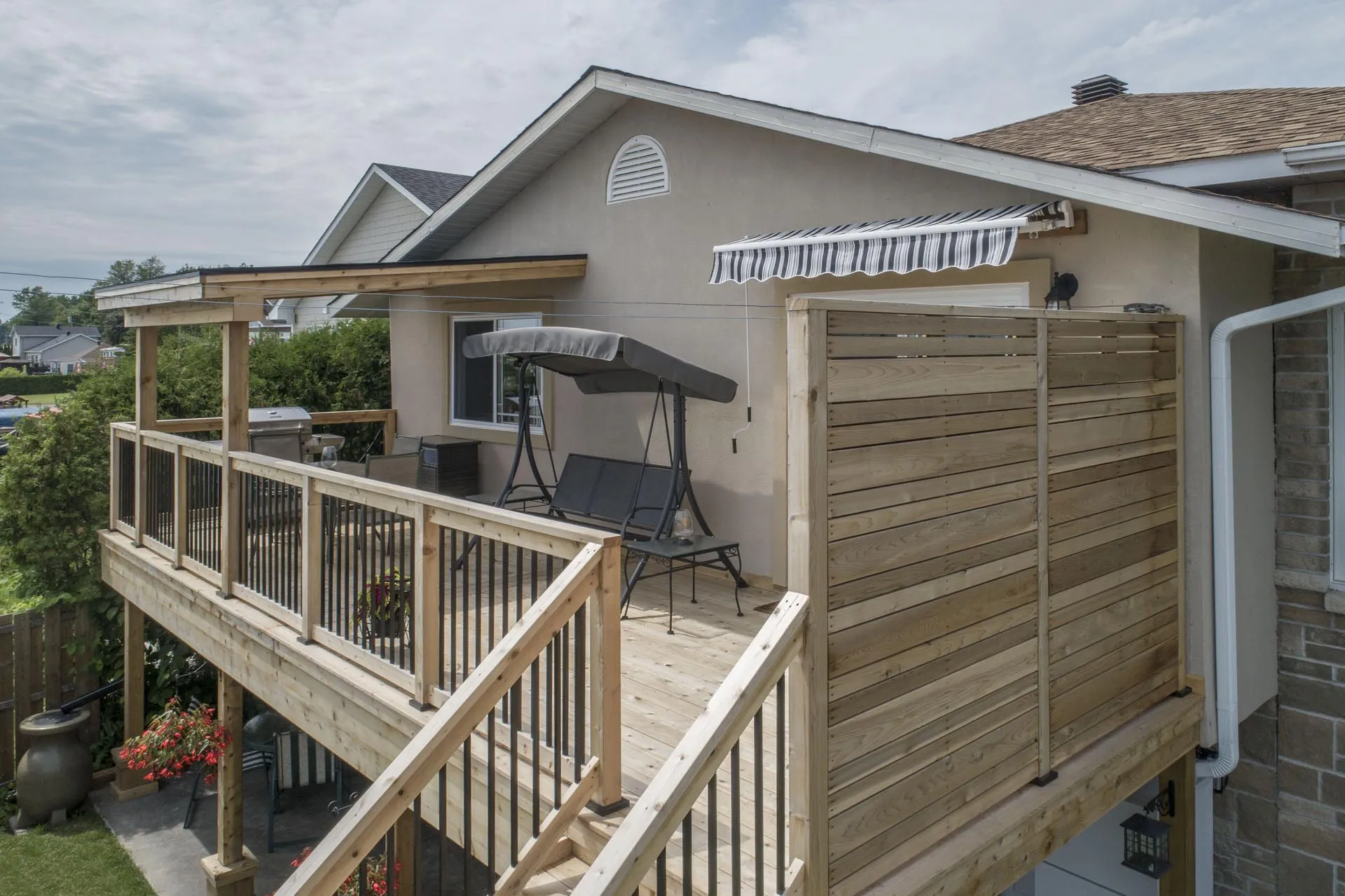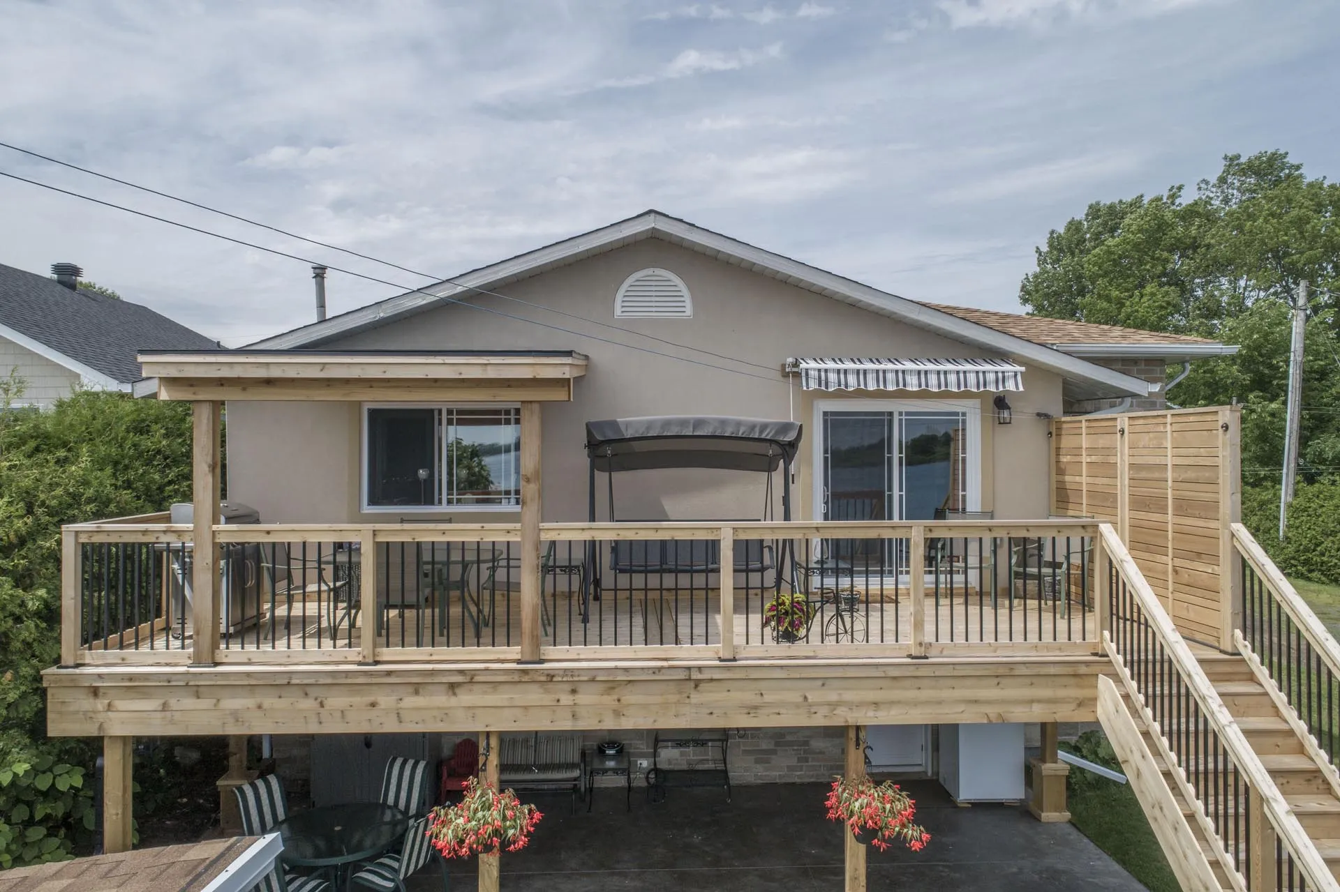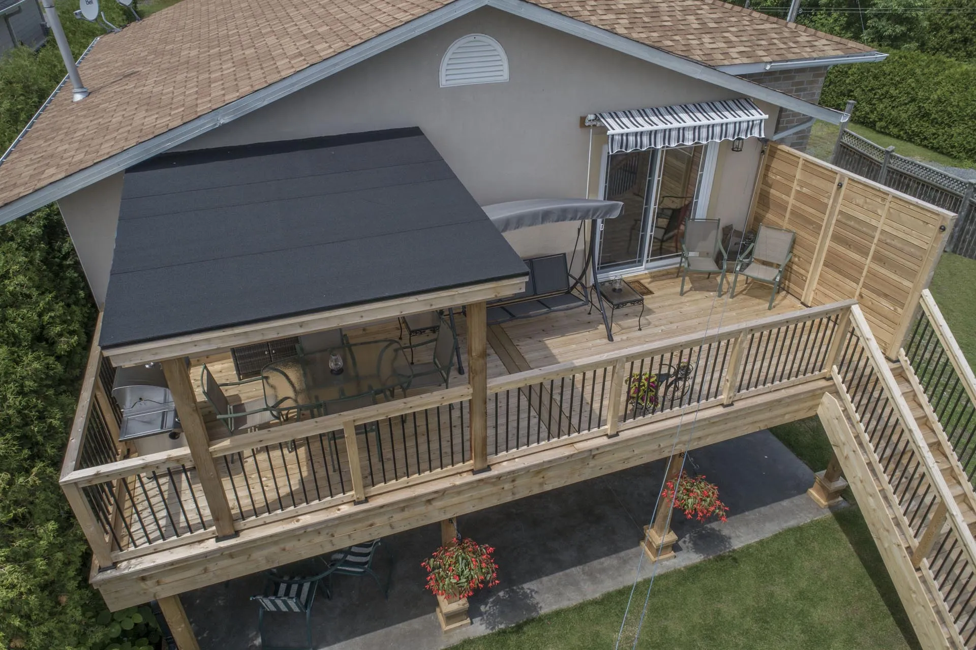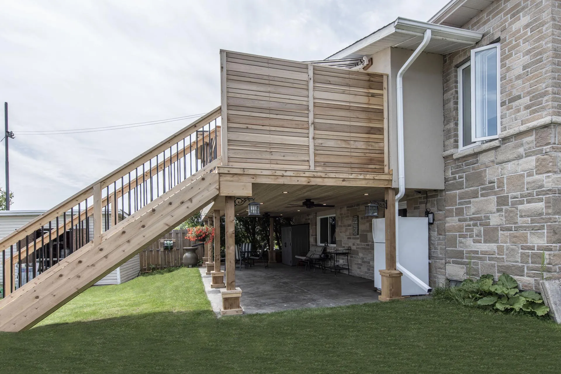 Two-storey cedar deck with custom slab-on-grade foundation and roof overhang, featuring a custom privacy screen and designed to maximize outdoor living space.