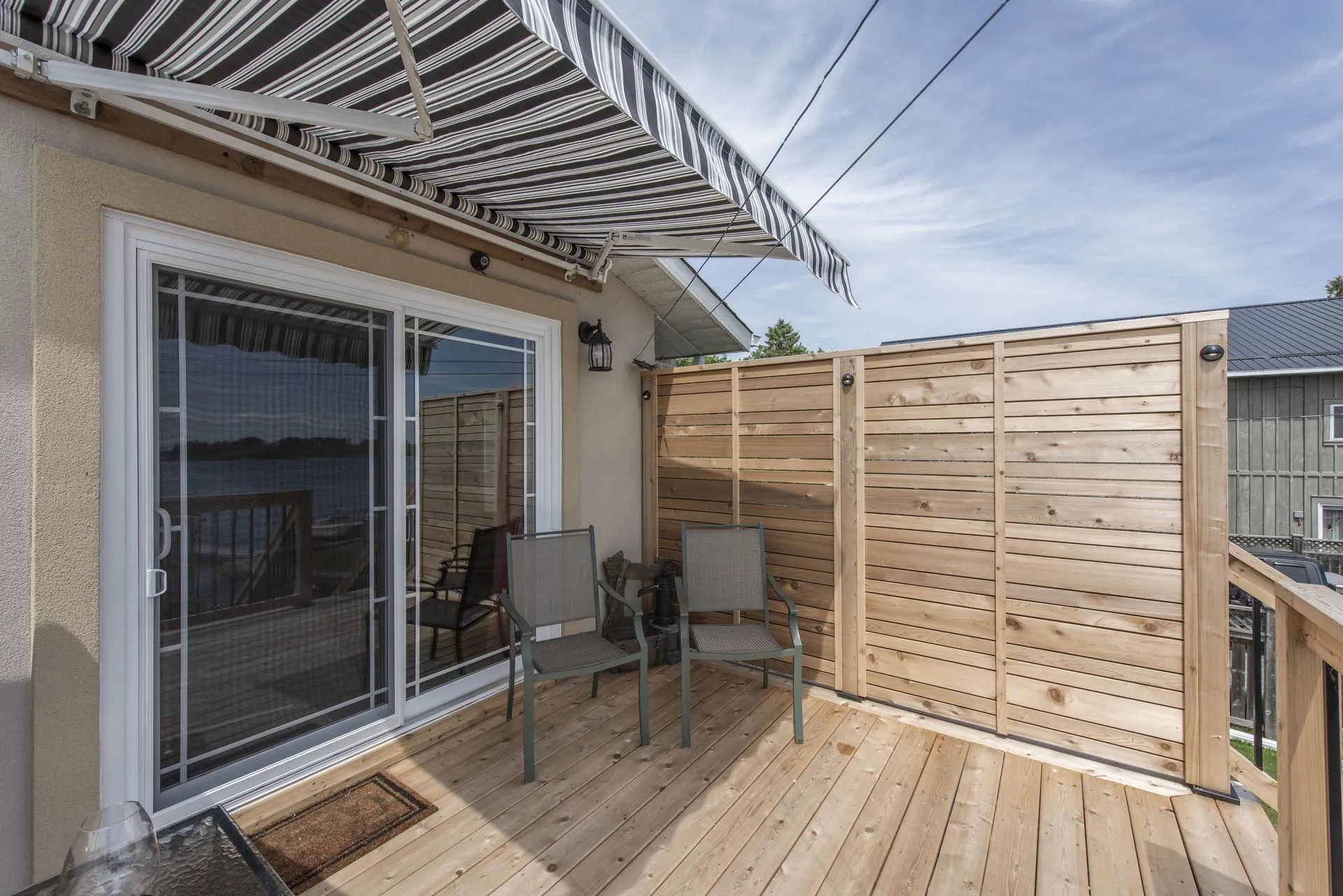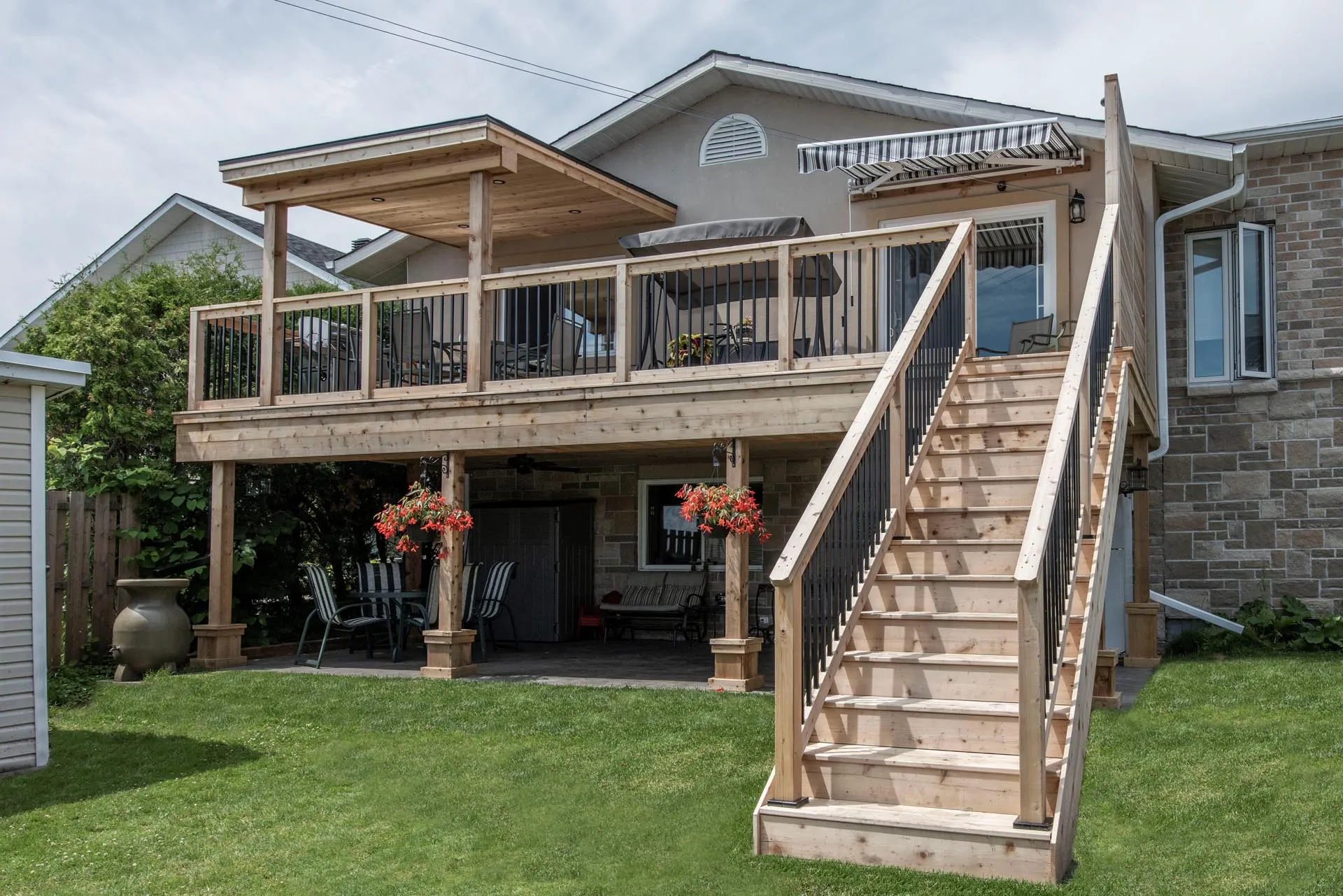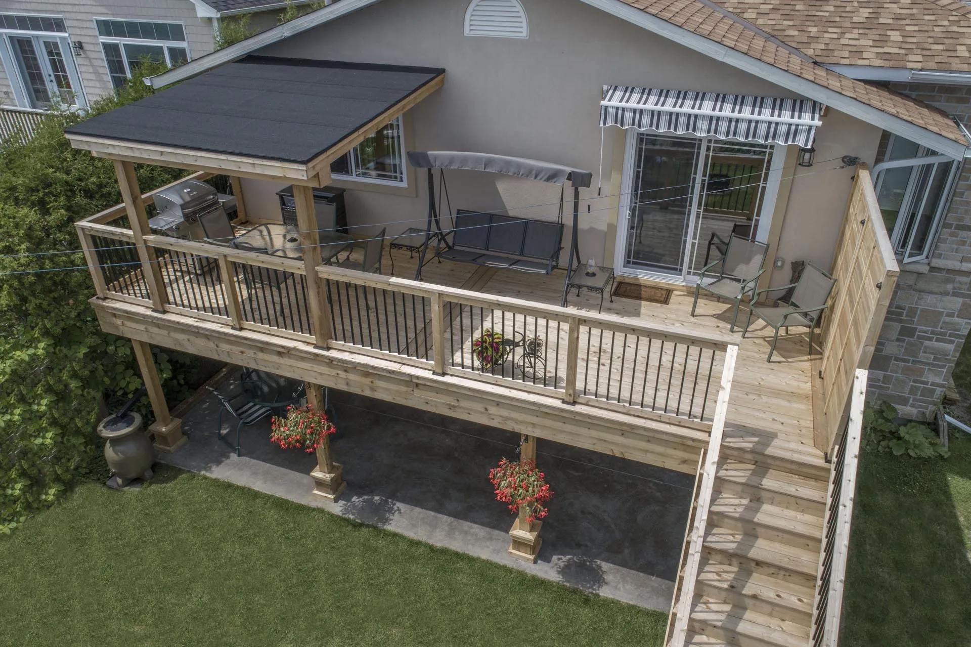 Two-storey cedar deck with custom slab-on-grade foundation and roof overhang, featuring a custom privacy screen and designed to maximize outdoor living space.