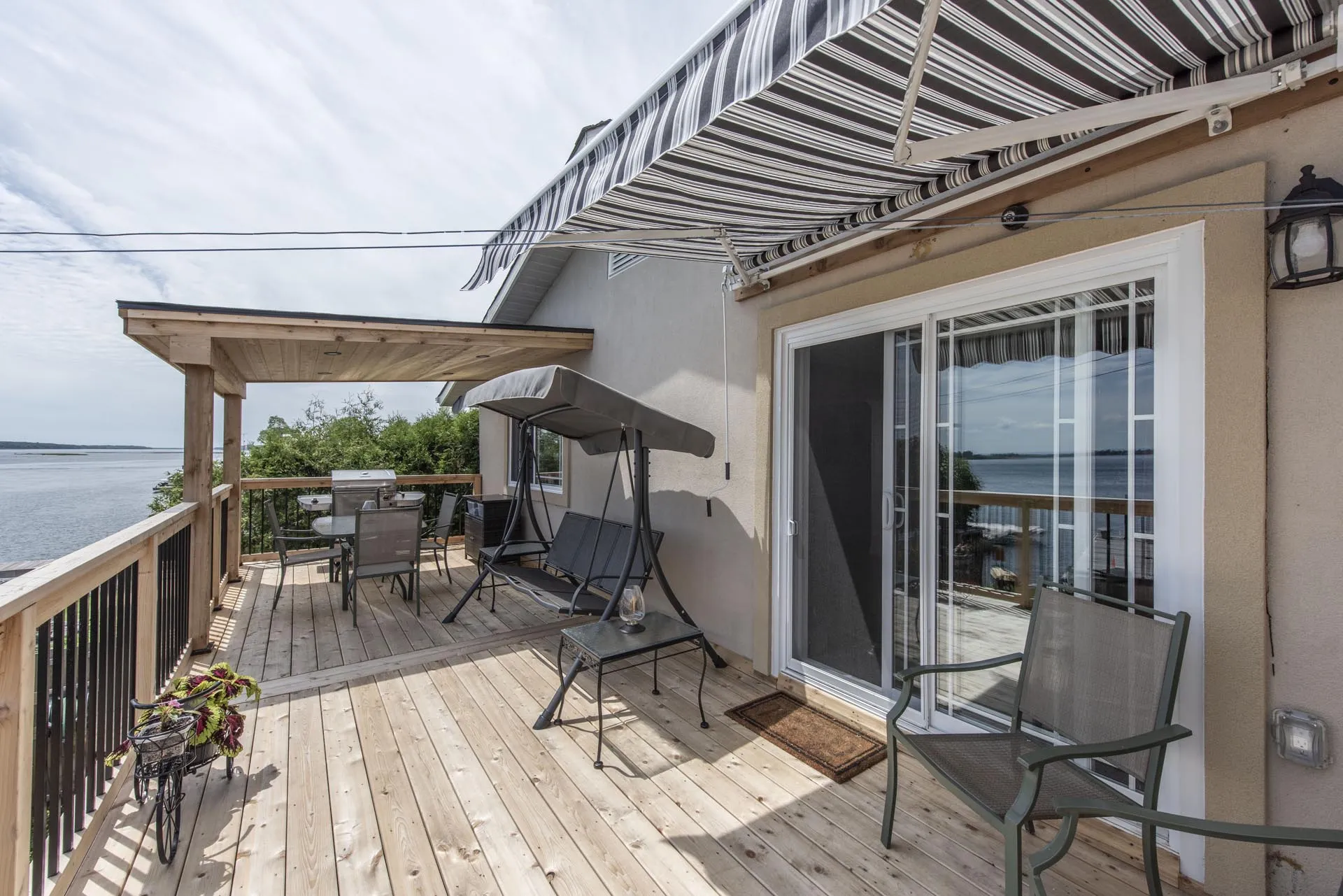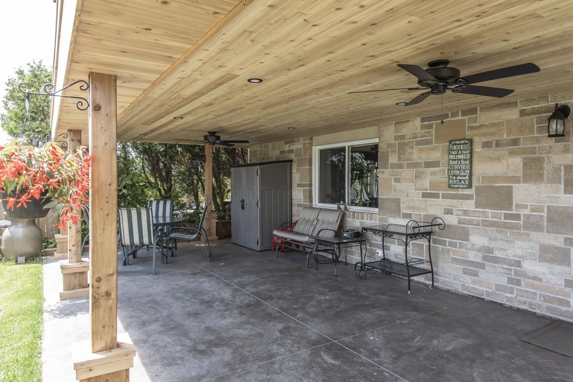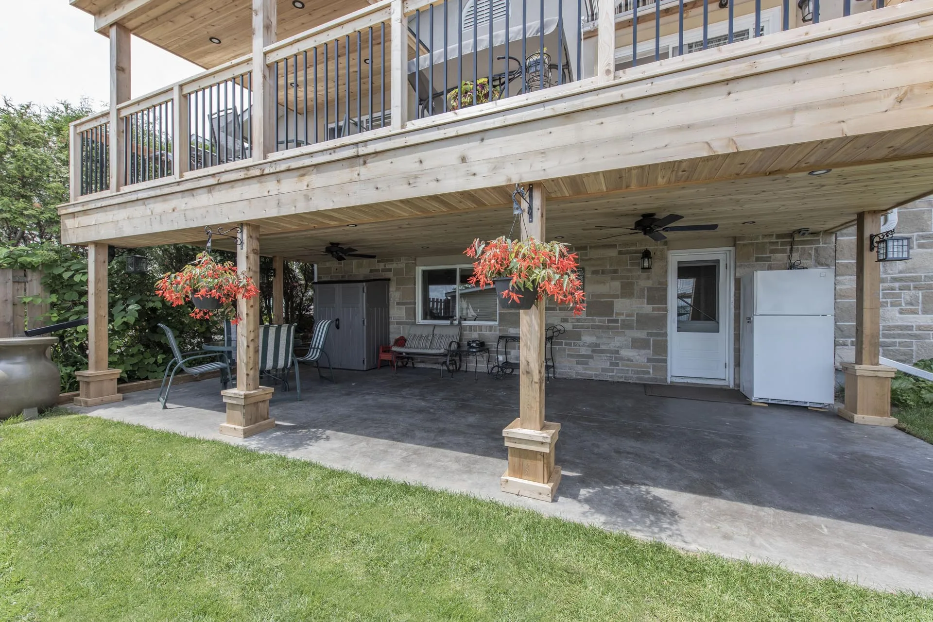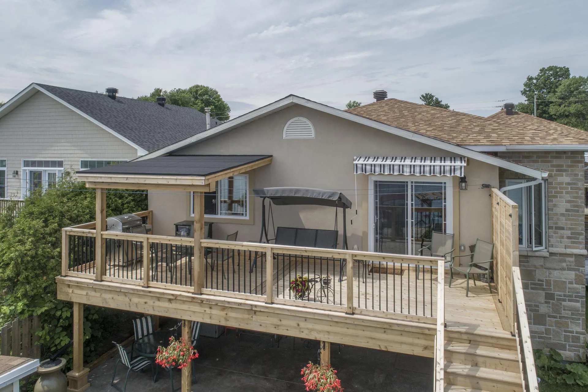 Two-storey cedar deck with custom slab-on-grade foundation and roof overhang, featuring a custom privacy screen and designed to maximize outdoor living space.