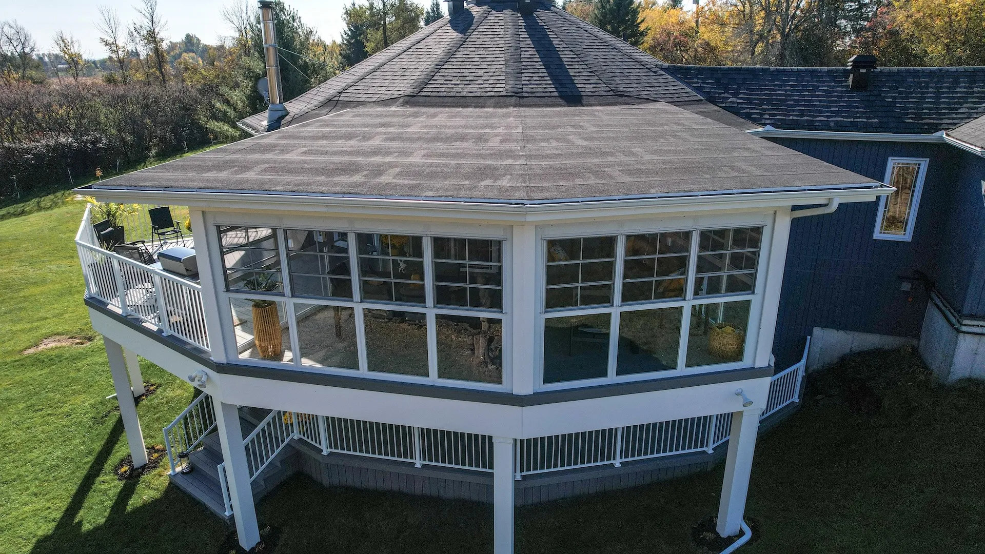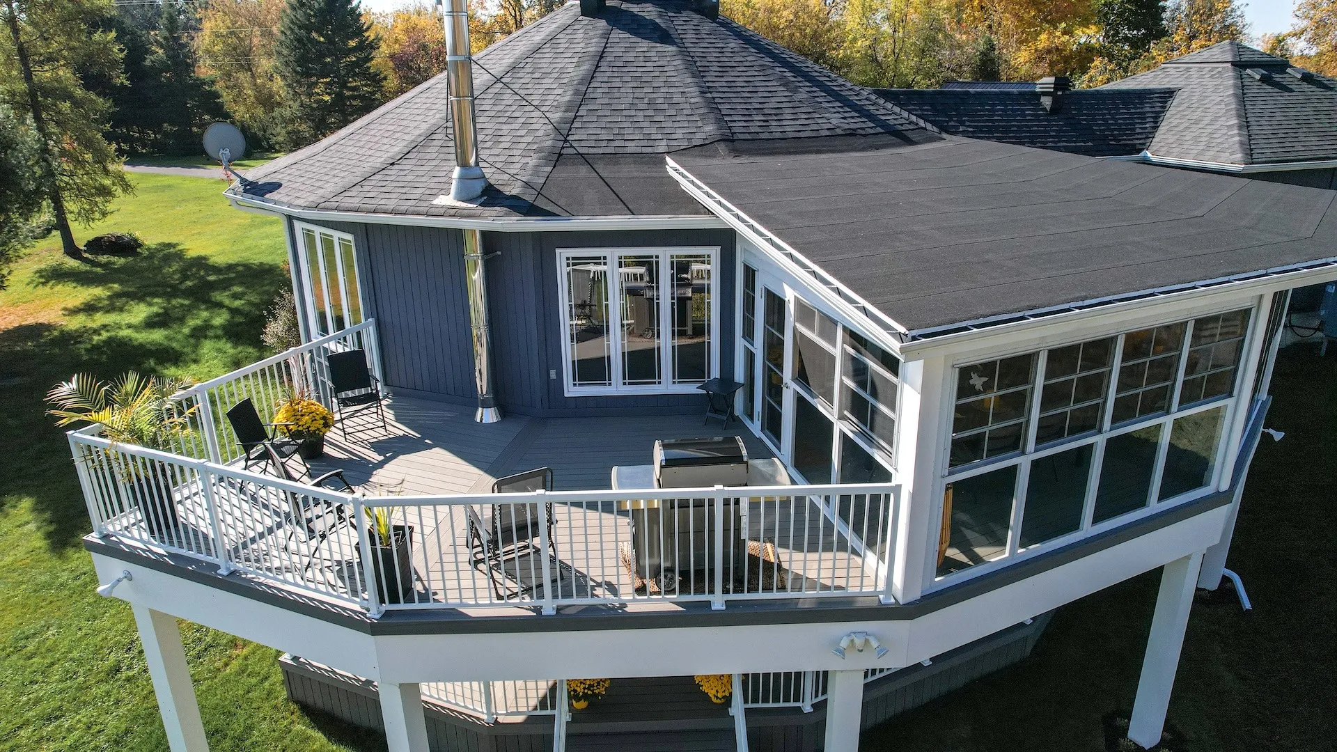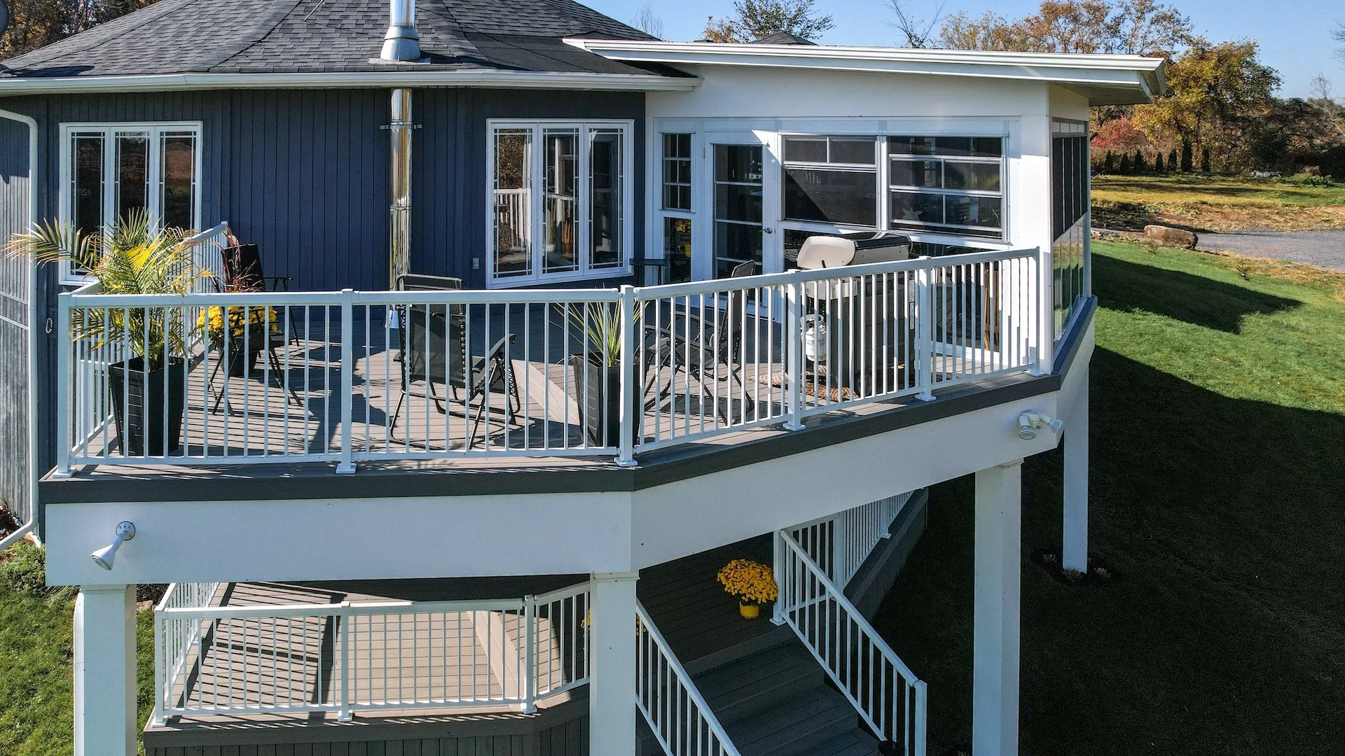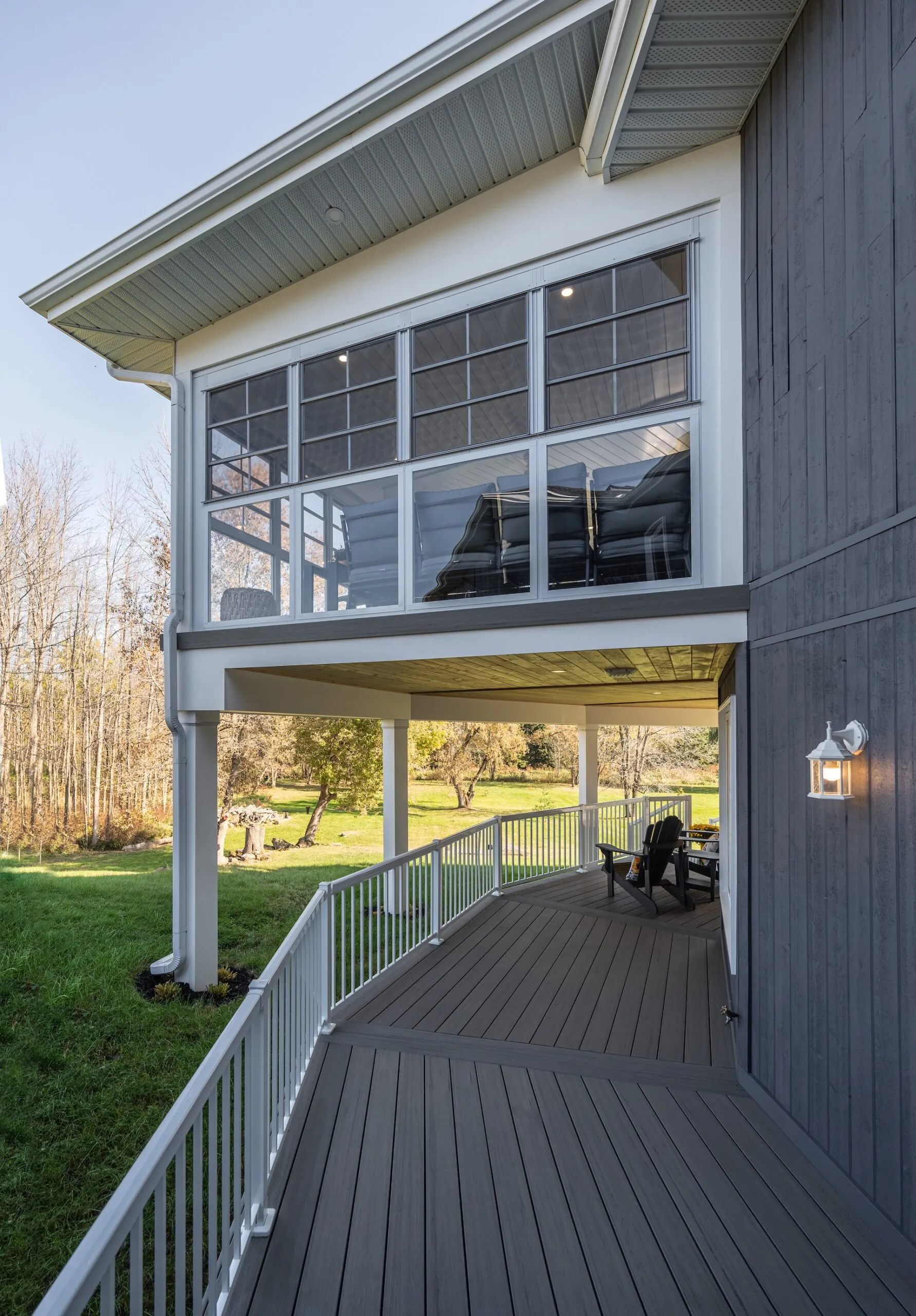 Elegant addition of a second-storey sunroom and two-storey custom deck, designed to enhance outdoor living and connectivity. The sunroom features floor-to-ceiling tempered glass walls and a custom low-slope roof, while the deck utilizes TimberTech composite decking with Regal aluminum railings and a RainEscape waterproofing system for a dry lower level.