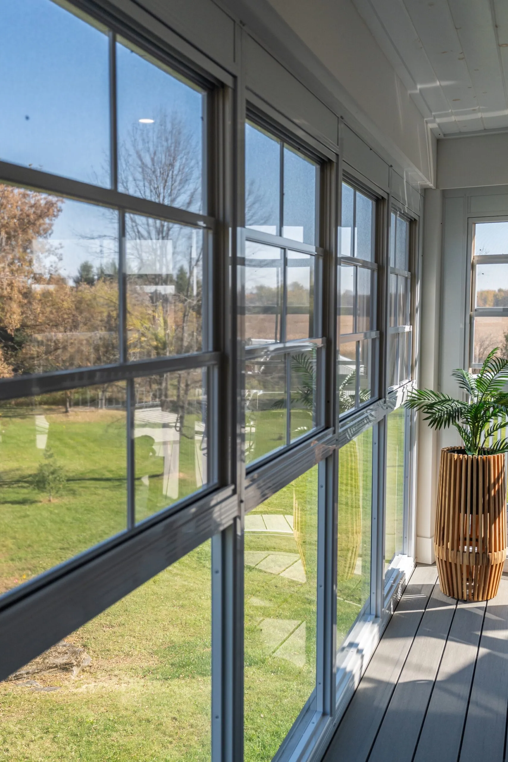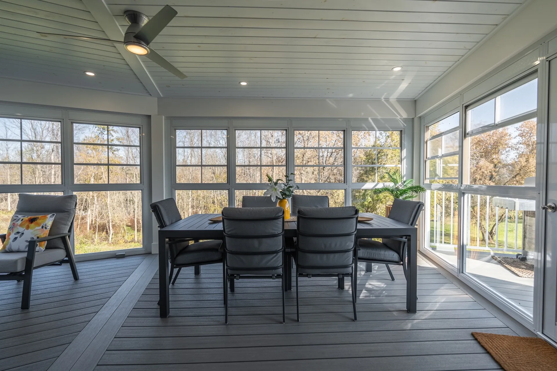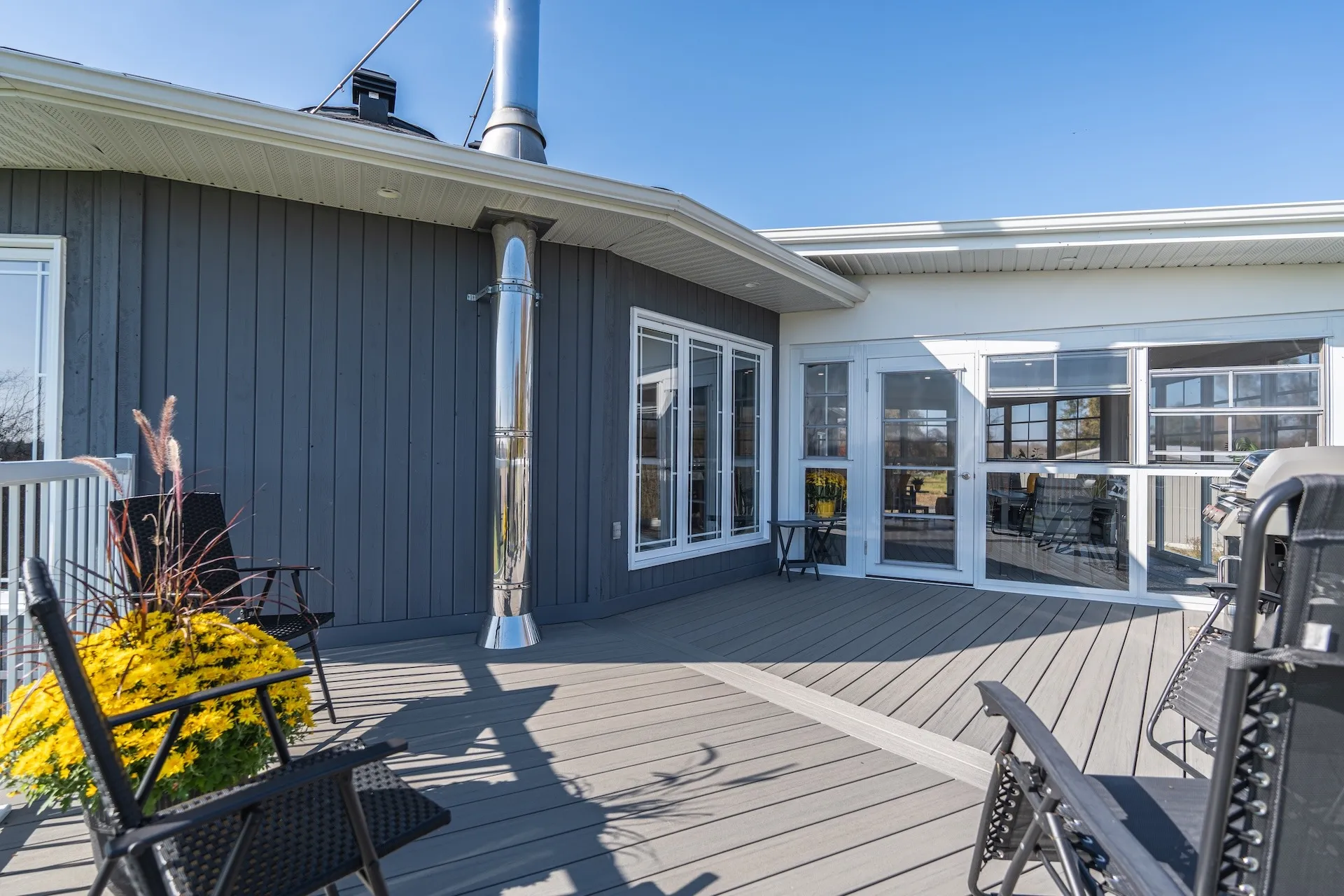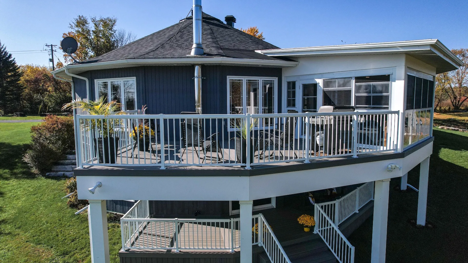 Elegant addition of a second-storey sunroom and two-storey custom deck, designed to enhance outdoor living and connectivity. The sunroom features floor-to-ceiling tempered glass walls and a custom low-slope roof, while the deck utilizes TimberTech composite decking with Regal aluminum railings and a RainEscape waterproofing system for a dry lower level.