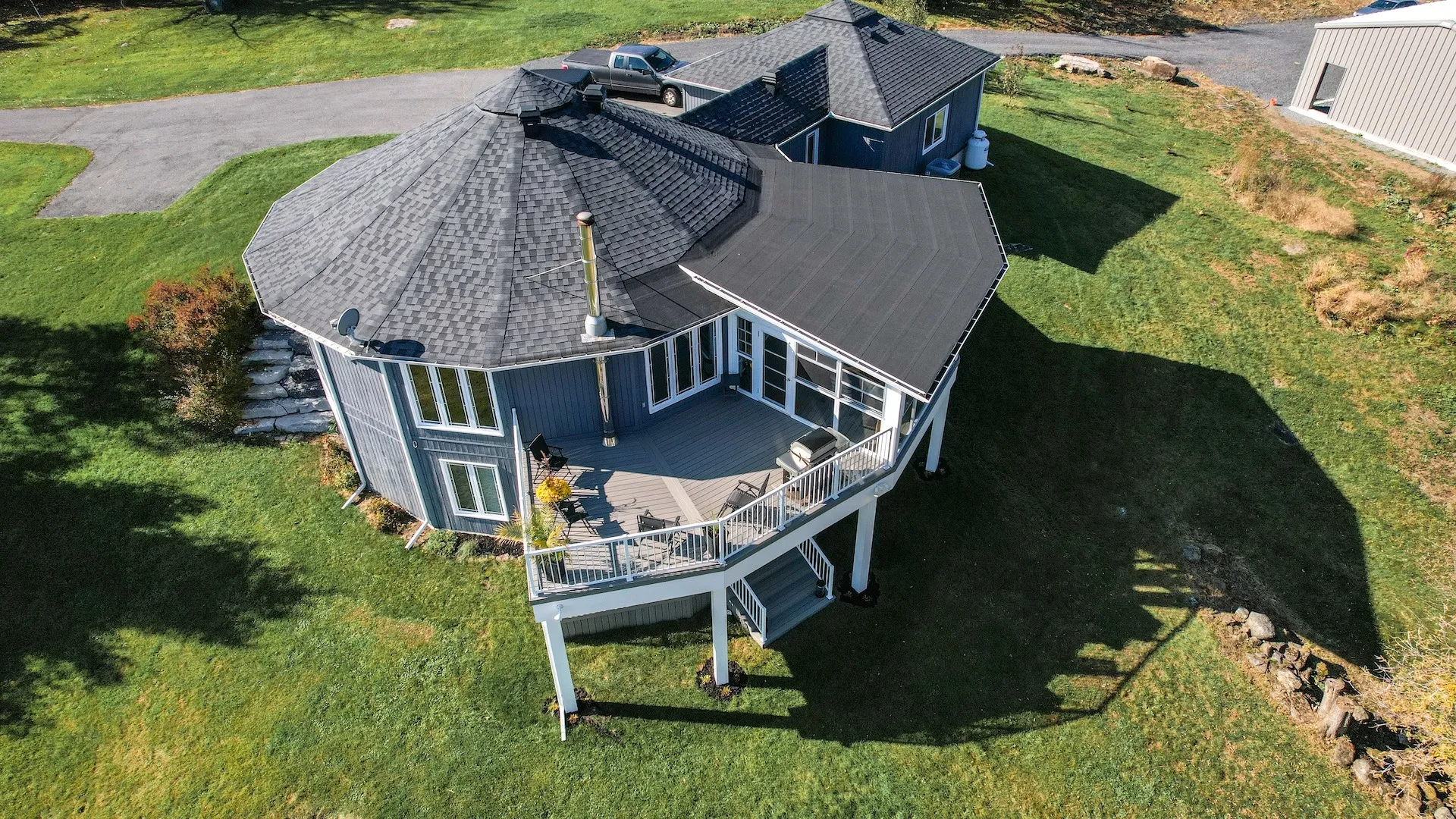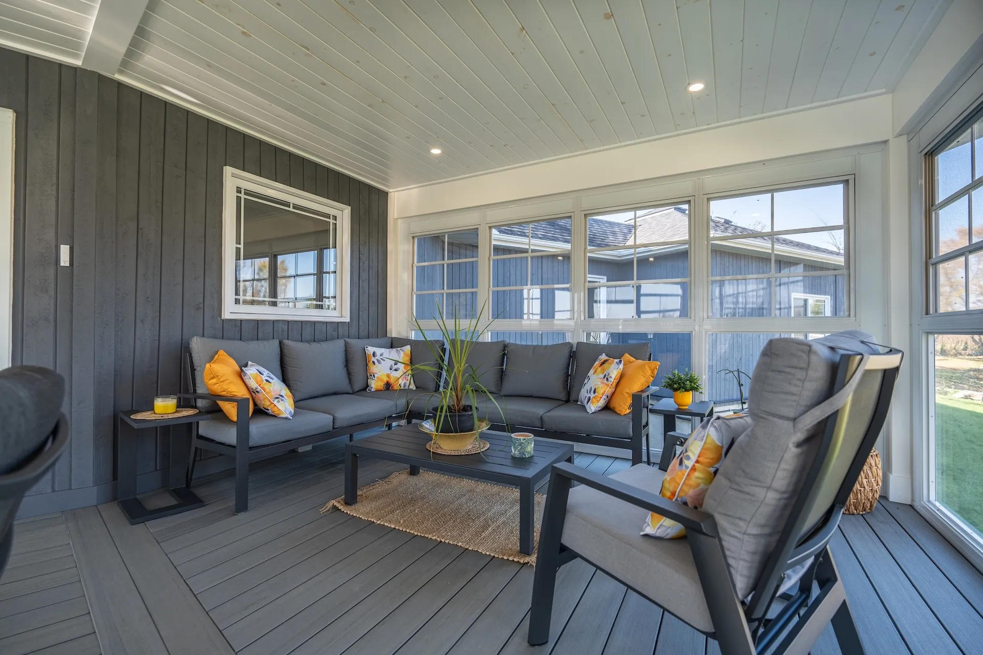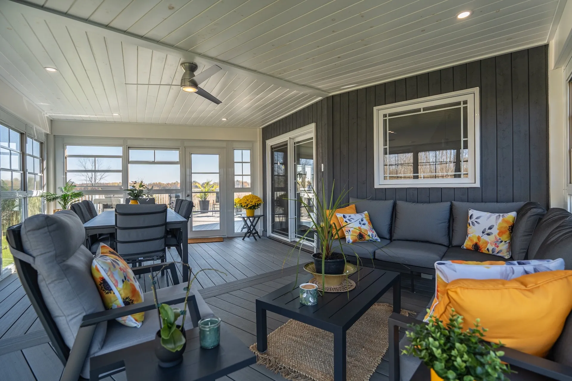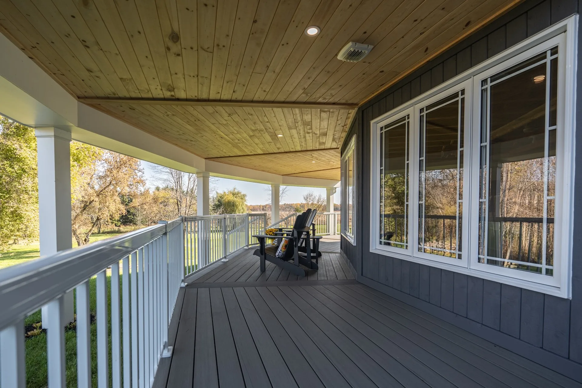Elegant addition of a second-storey sunroom and two-storey custom deck, designed to enhance outdoor living and connectivity. The sunroom features floor-to-ceiling tempered glass walls and a custom low-slope roof, while the deck utilizes TimberTech composite decking with Regal aluminum railings and a RainEscape waterproofing system for a dry lower level.